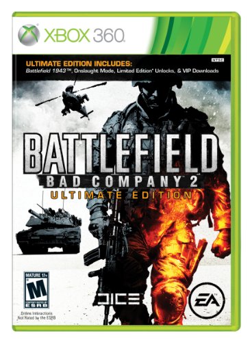 | Battlefield Bad Company 2 is a first-person shooter, and sequel to Electronic Arts' 2008 release, Battlefield Bad Company. Following the continuing combat adventures of misfits of the US Army's Company "B," Bad Company 2 features the characteristic humor and grit of the Bad Company series, as well as a variety of gameplay improvements and additions, including 2-24 player online support; all-new four man squad gameplay; and more. The Ultimate Edition includes Battlefield 1943 and Onslaught co-op mode, as well as the early-access unlocks from the Limited Edition. The package also includes a VIP code granting access to a multitude of downloadable map packs. Like the original Battlefield: Bad Company game, Bad Company 2 is a first-person shooter following the exploits of Company "B" of the US Army's 222nd Battalion. In this new adventure, the more mature yet still infamous company of misfits are tasked with interceding in a series of conflicts that have the potential to ignite of a new World War. Game environments cover snowy mountains, all the way to jungles and deserts.